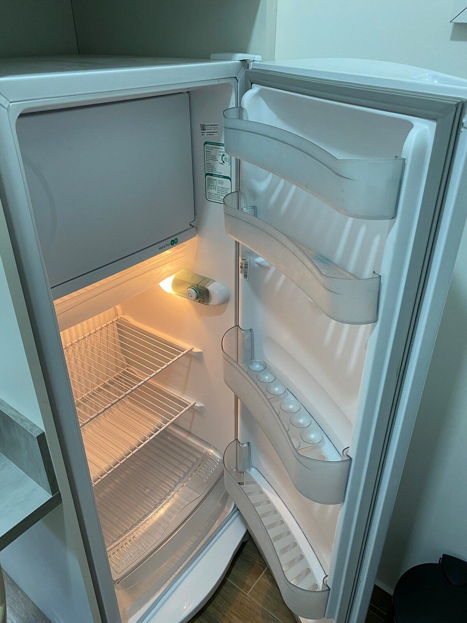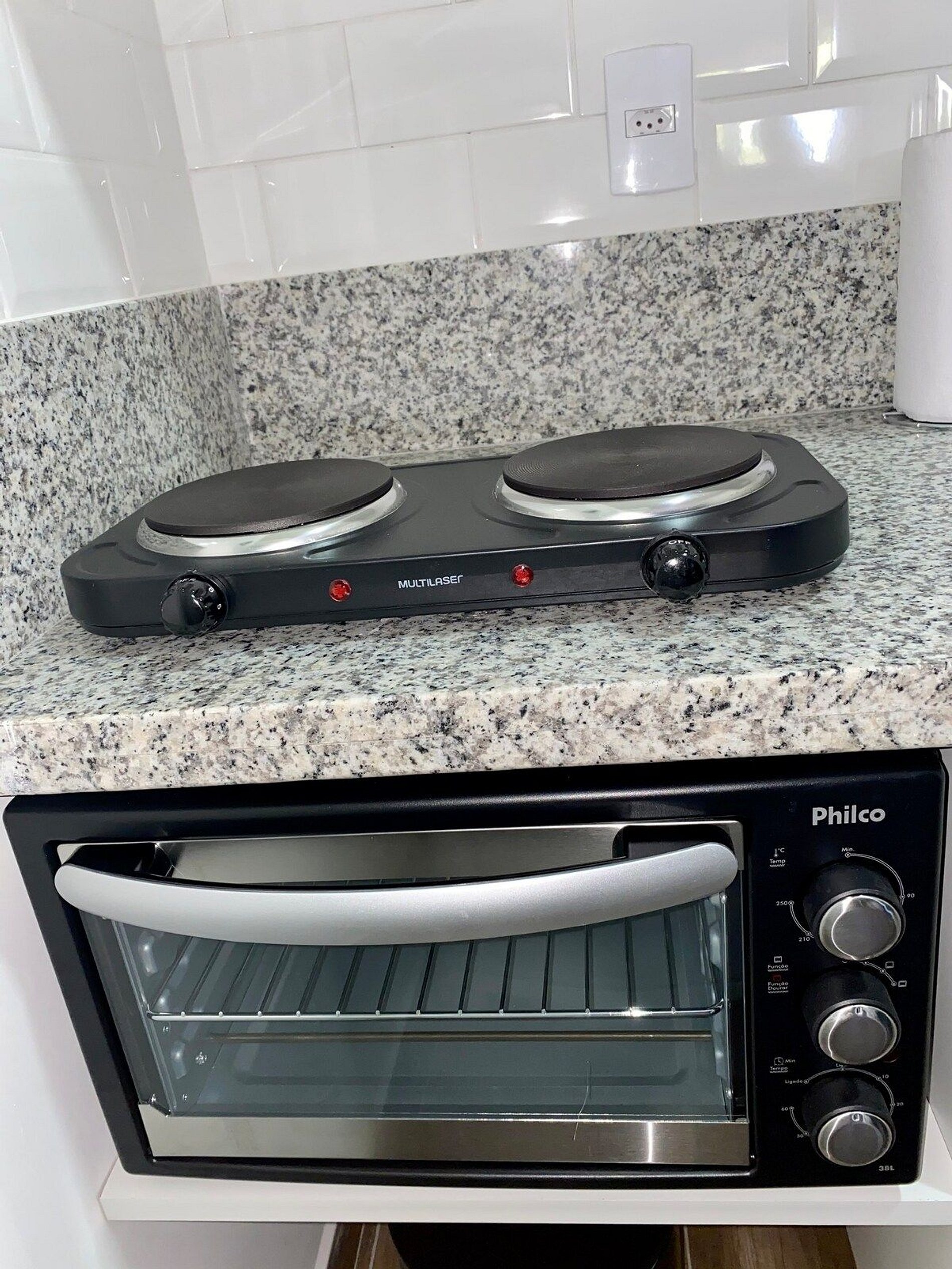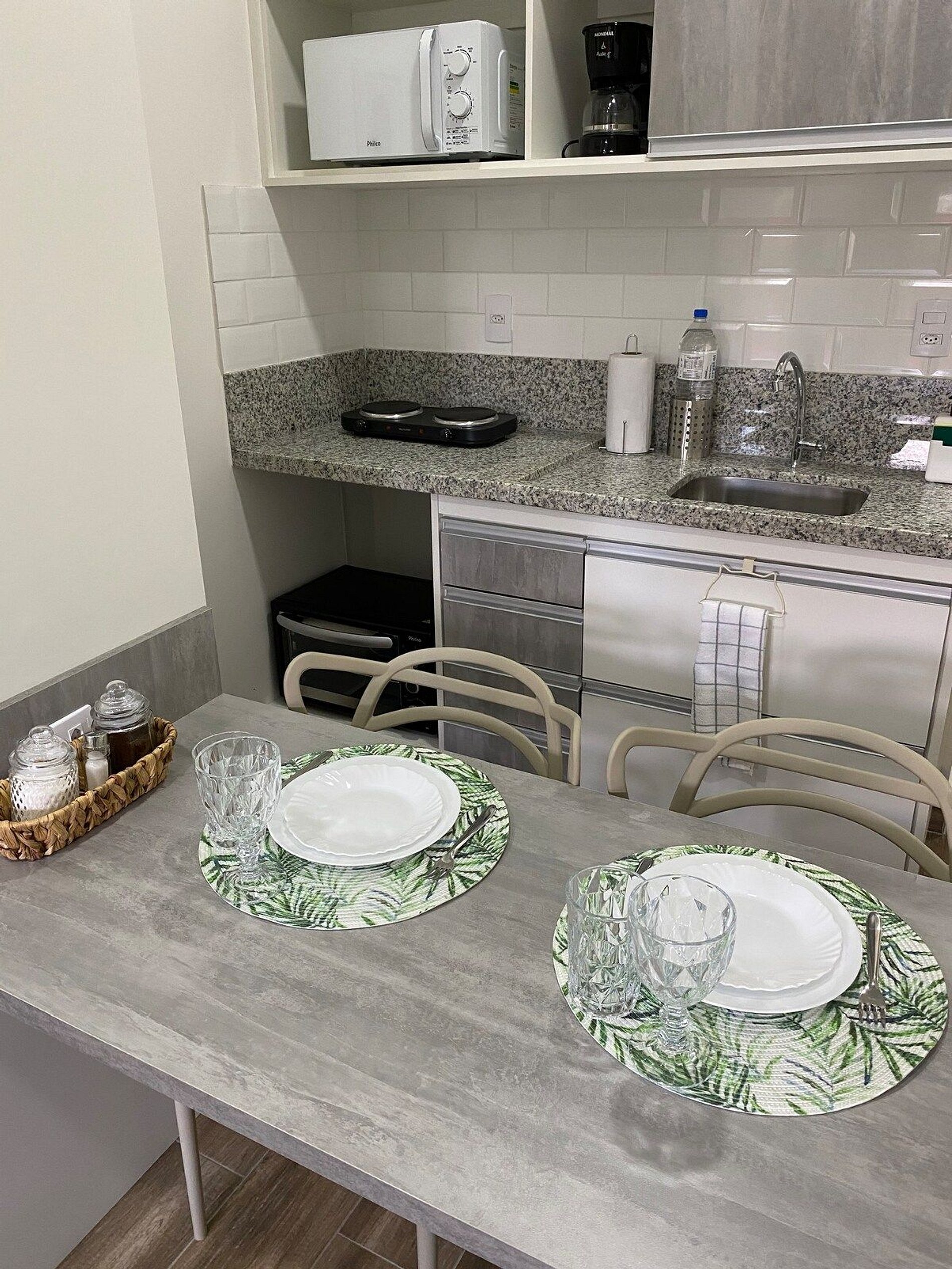 Cozinha compacta- frigobar ou geladeira, cooktop, microondas, panelas, pratos, copos, xícaras e talheres. (Forno elétrico, Liquidificador e Toxtex podem ser solicitados)*