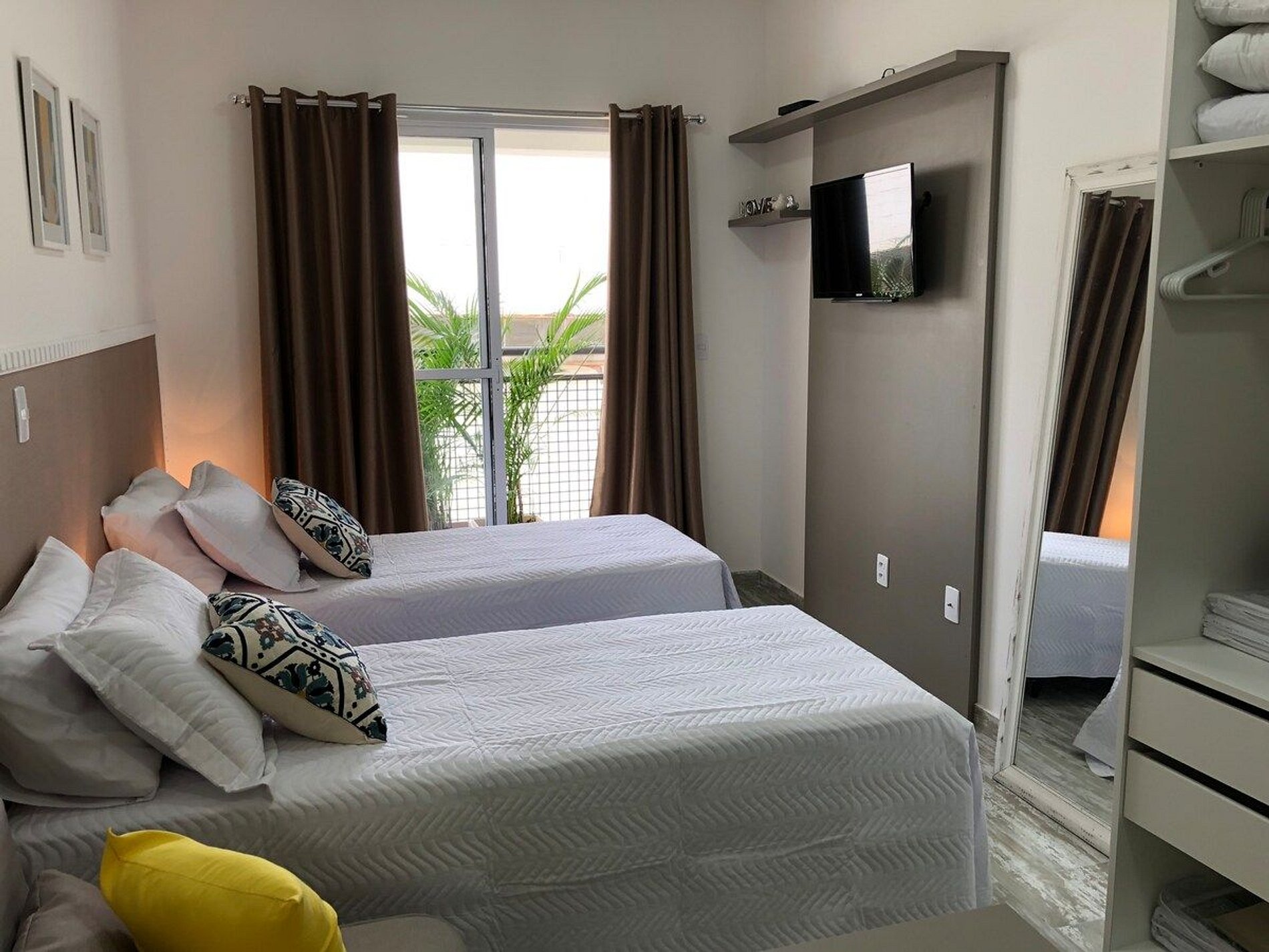 Tudo novinho, decorado com muito carinho e pensado no conforto e praticidade de nossos hóspedes. - Ar condicionado, cortina Black out - TV Smart e wi-fi de alta velocidade - Cama Box – Configurado com 2 camas de solteiro ou uma casal quen e um beliche para mais 2 pessoas– Mini closet