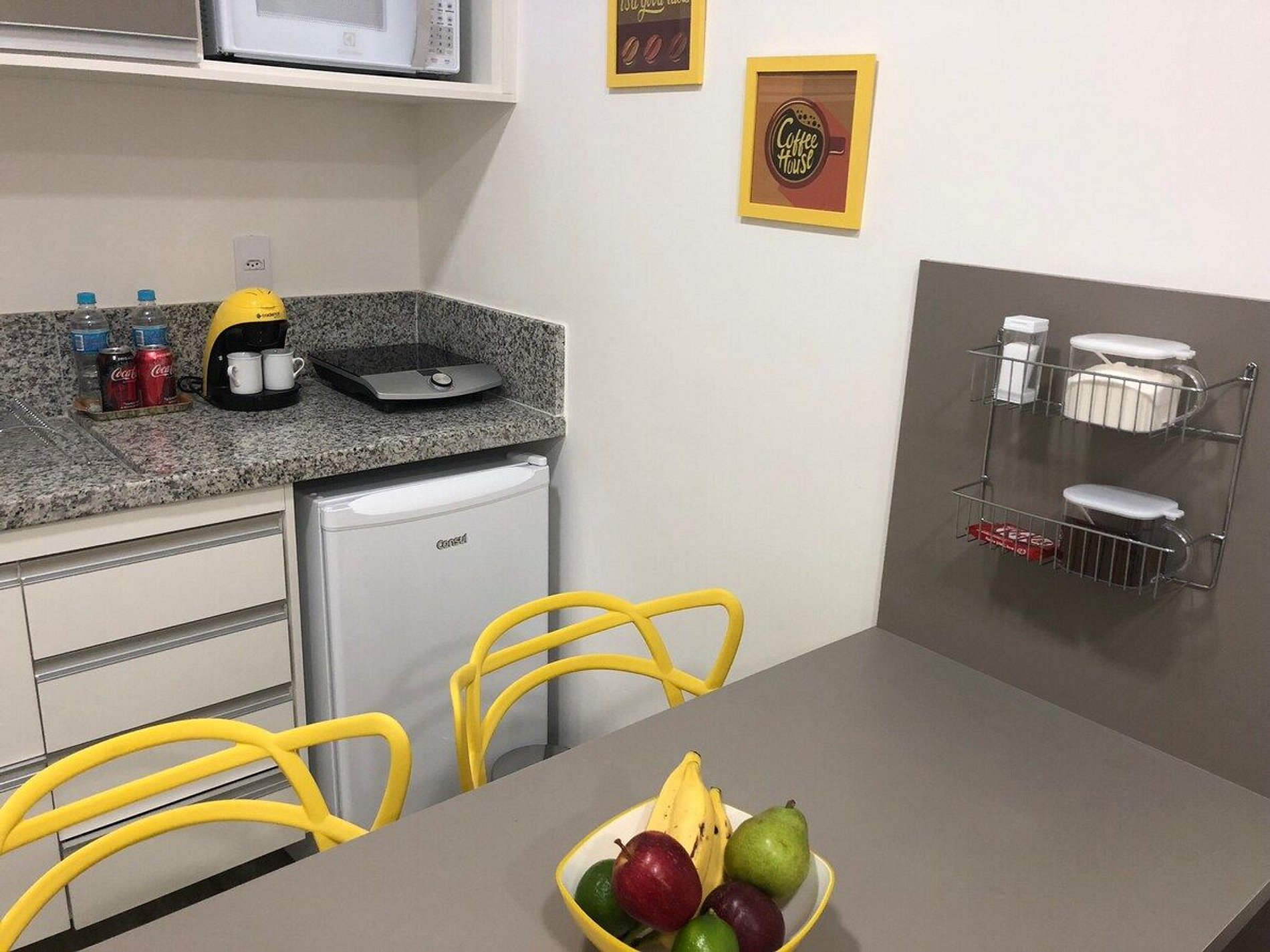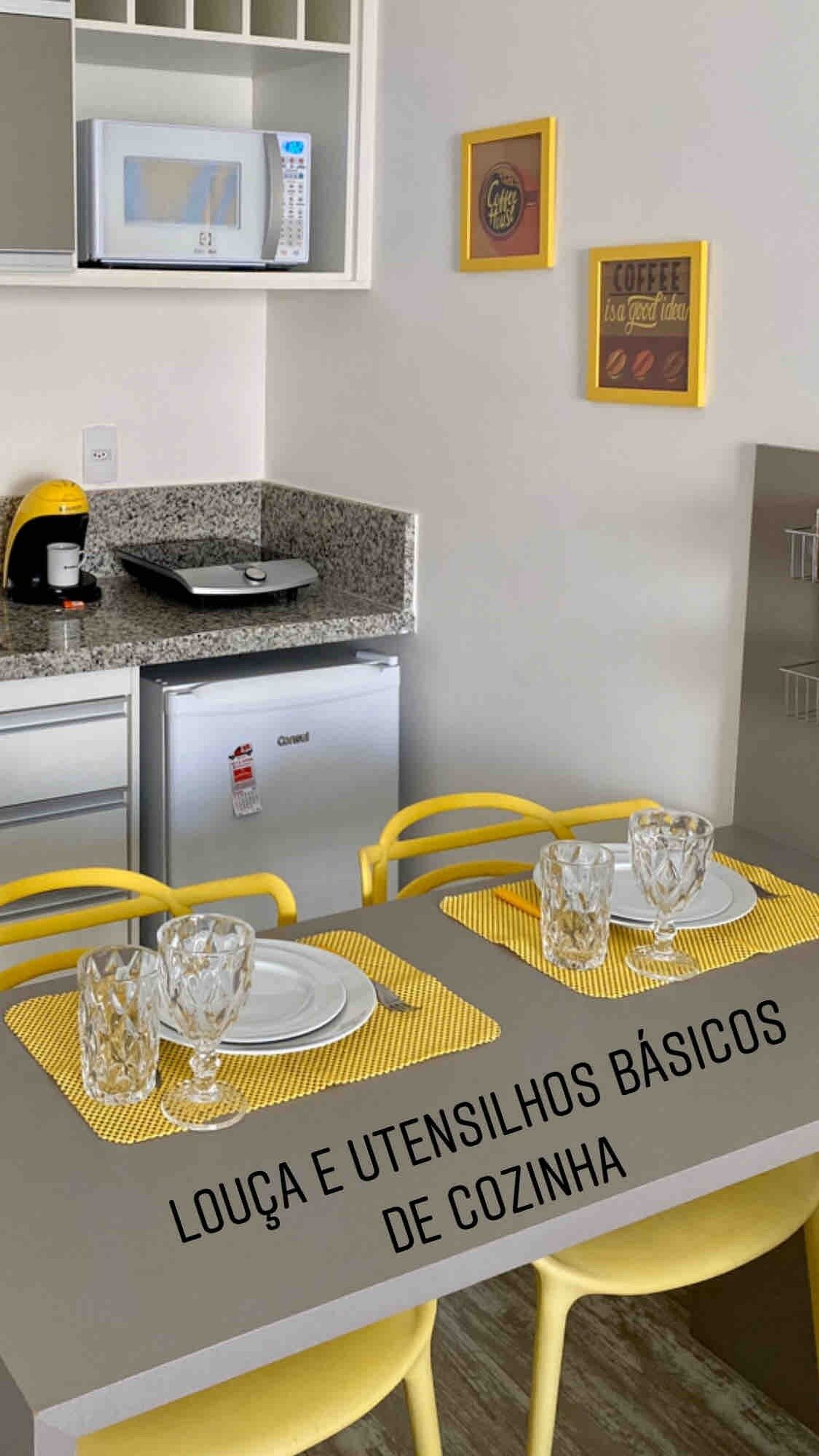 Cozinha compacta- frigobar ou geladeira, cooktop, microondas, panelas, pratos, copos, xícaras e talheres. (Forno elétrico, Liquidificador e Toxtex podem ser solicitados)*