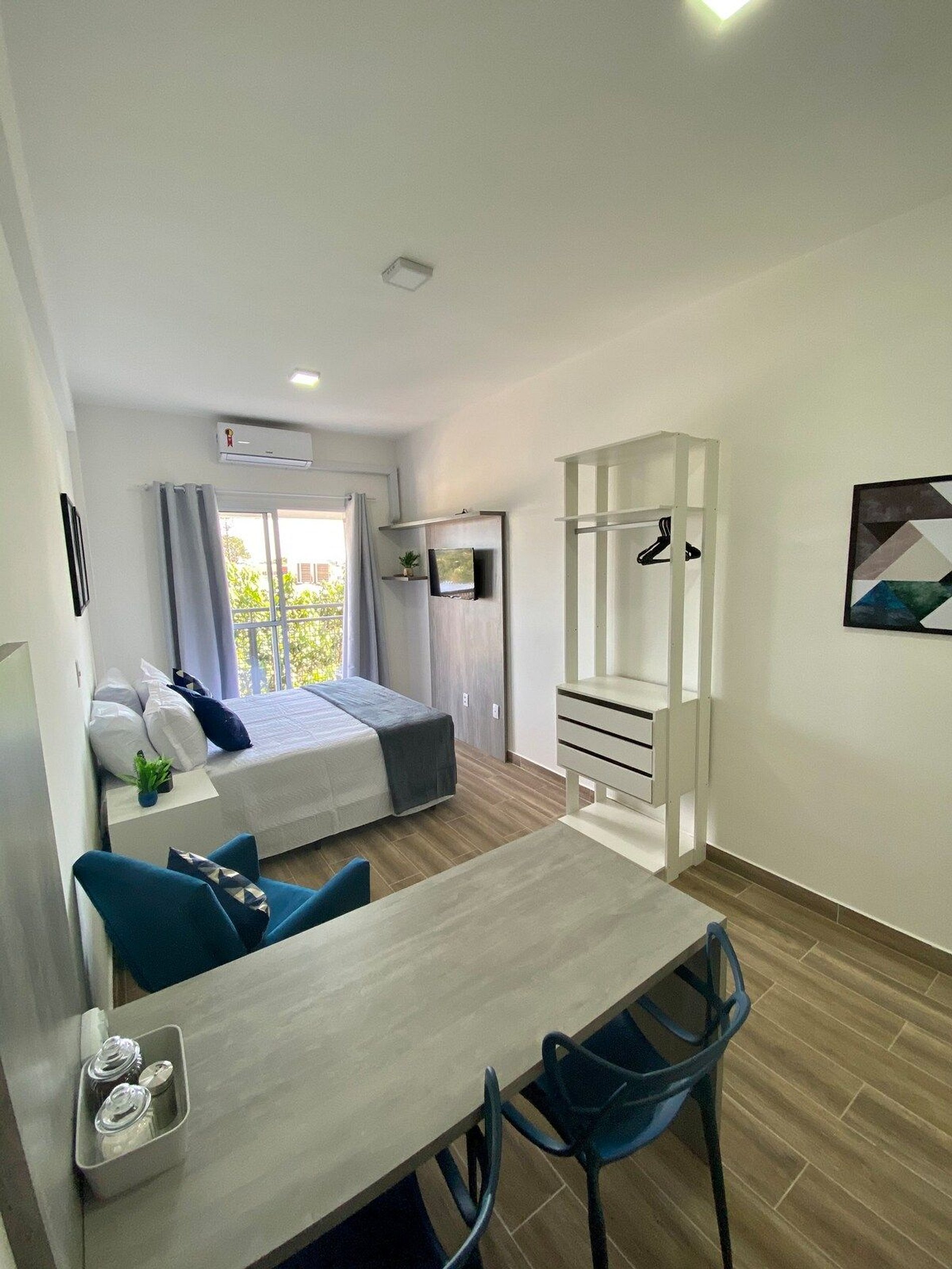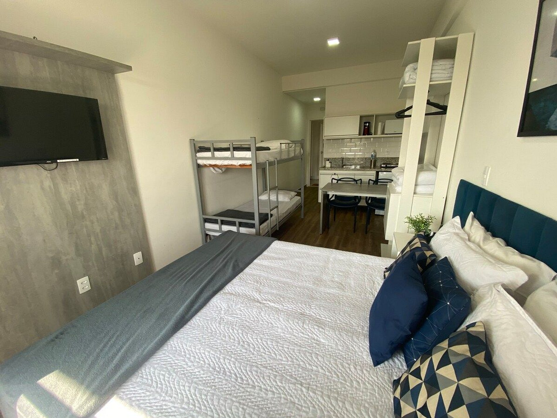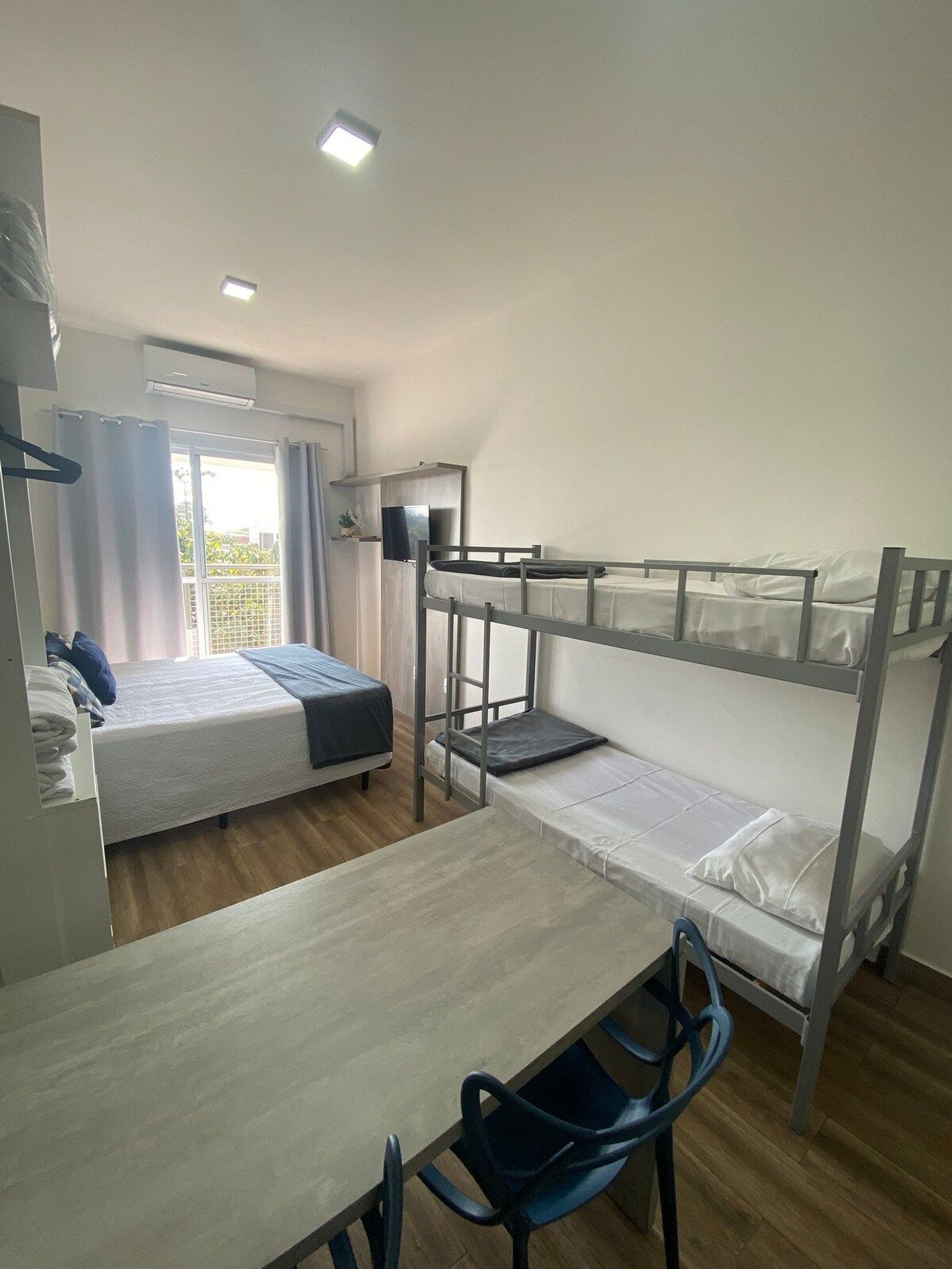 Tudo novinho, decorado com muito carinho e pensado no conforto e praticidade de nossos hóspedes. - Ar condicionado, cortina Black out - TV Smart e wi-fi de alta velocidade - Cama Box – Configurado com 2 camas de solteiro ou uma casal quen e um beliche para mais 2 pessoas– Mini closet