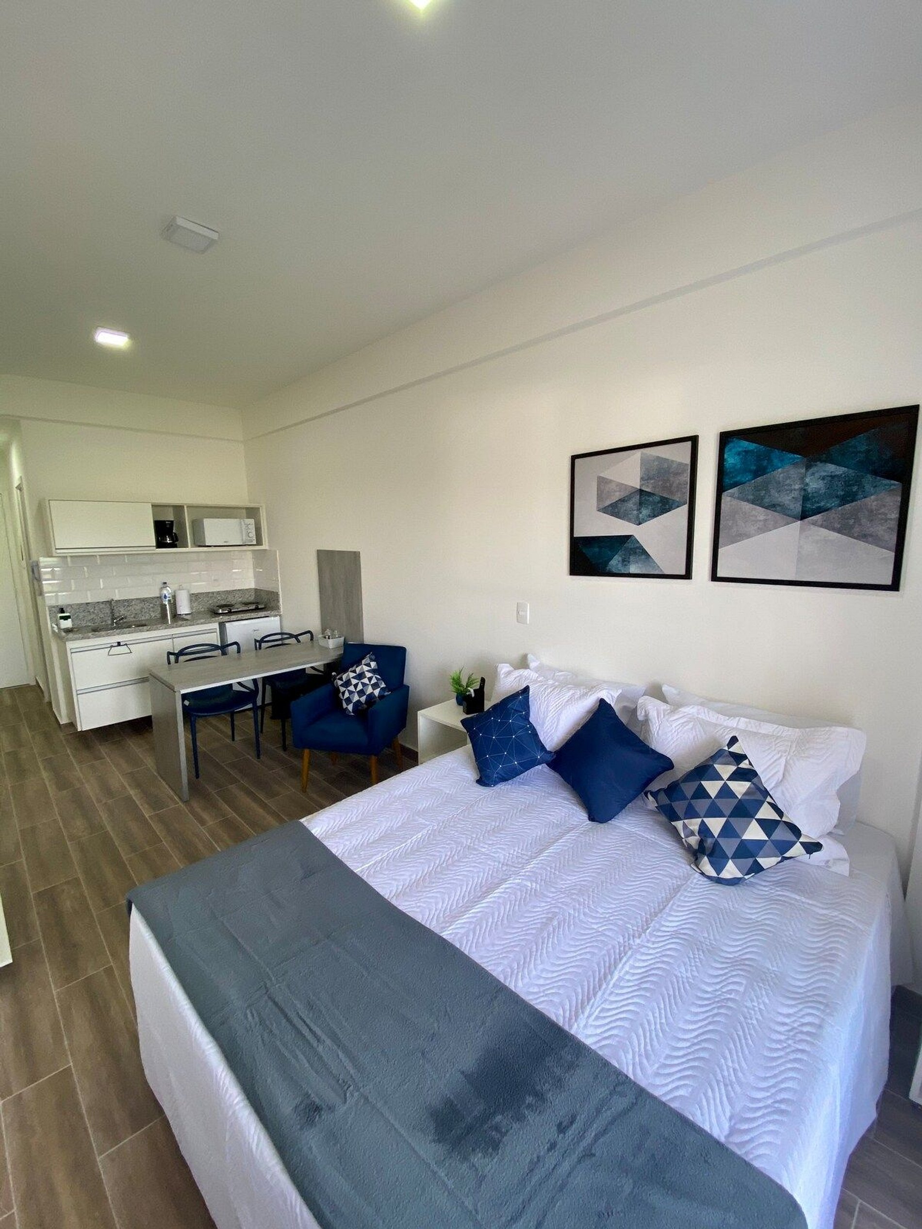 Cozinha compacta- frigobar , cooktop, microondas, panelas, pratos, copos, xícaras e talheres. (Forno elétrico, Liquidificador e Toxtex podem ser solicitados)*