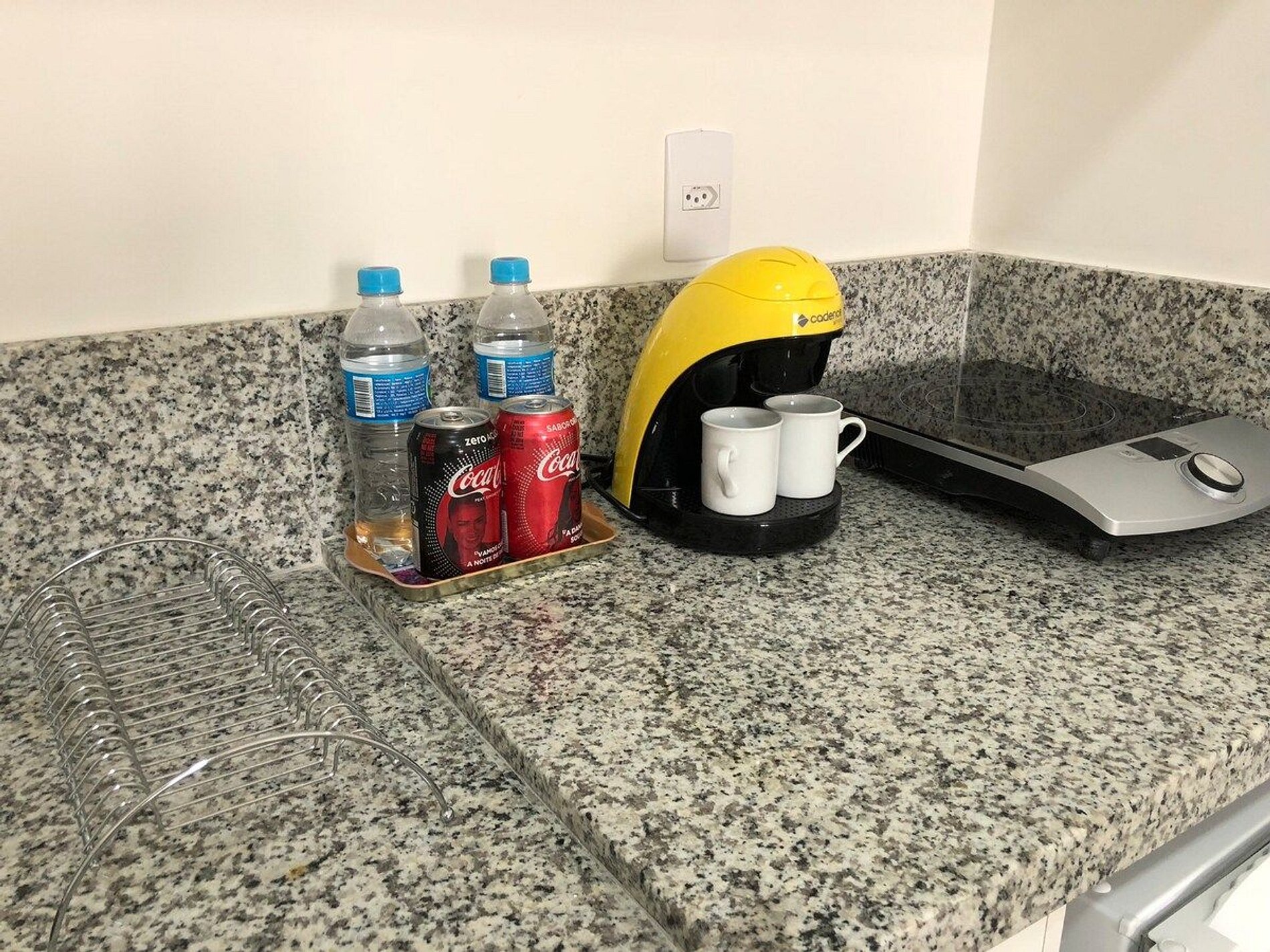Cozinha compacta- frigobar ou geladeira, cooktop, microondas, panelas, pratos, copos, xícaras e talheres. (Forno elétrico, Liquidificador e Toxtex podem ser solicitados)*