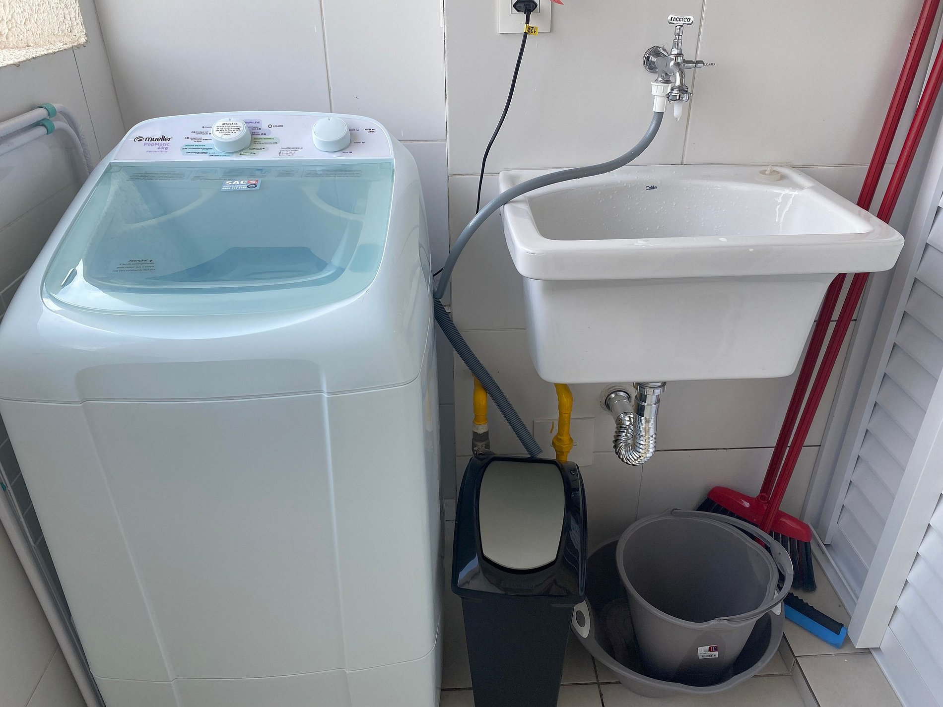 Área de serviço com tanque, lava-roupas e varal